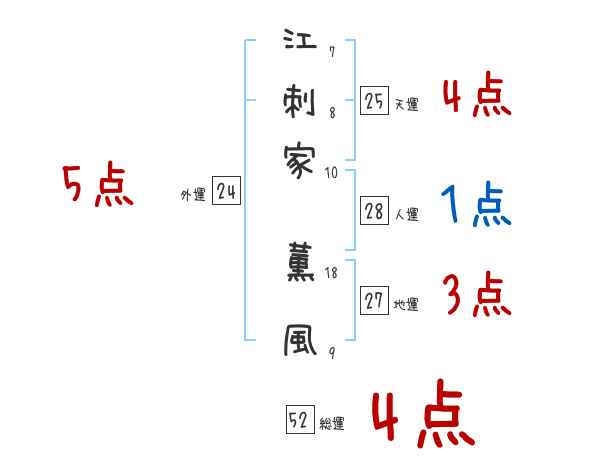外運![]() | 江刺家薫風さんの外運は24画の5つ星!家庭運が良く順調な人生。金運にも恵まれる。 生活面を象徴する運勢です。外部から受ける影響力を表し、結婚運、家庭運や職場、環境への順応性を表します。 |