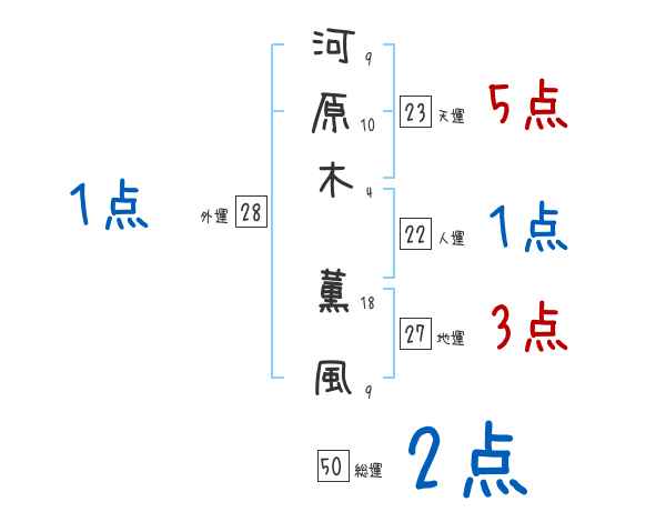 天運![]() | 河原木薫風さんの天運は23画の5つ星!想像力に優れ活力がある。一代で成功し名誉を手に入れる。 家系が持つ宿命的な運勢を表します。祖先から受け継いだ苗字ですので自分の力が及びません。家柄を象徴します。 |