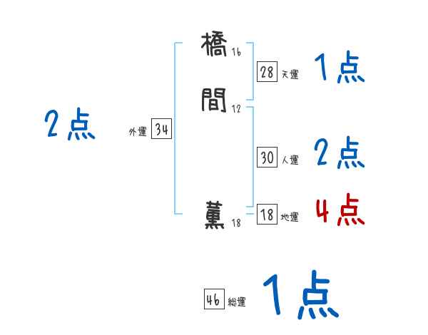 天運![]() | 橋間薫さんの天運は28画の1つ星!家庭環境に注意。スポーツで活躍できる能力があるかも。 家系が持つ宿命的な運勢を表します。祖先から受け継いだ苗字ですので自分の力が及びません。家柄を象徴します。 |
