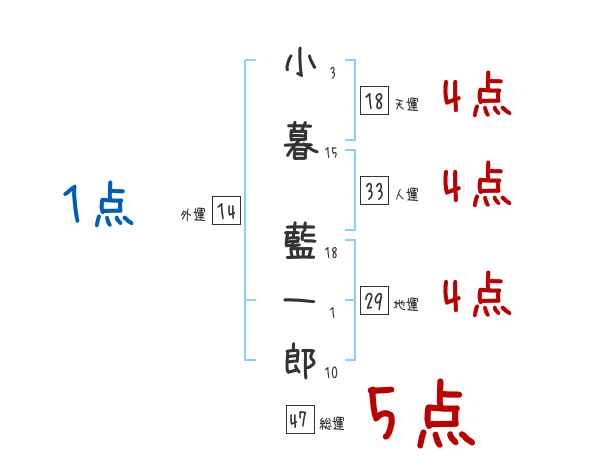 総運![]() | 小暮藍一郎さんの総運は47画の5つ星!実力が開花し発展する円満な人生。財に恵まれる。 あなたの人生を表す1番重要な運勢です。生涯を通じて影響する総合運となり、主に50歳以降の晩年期に影響を及ぼします。 |