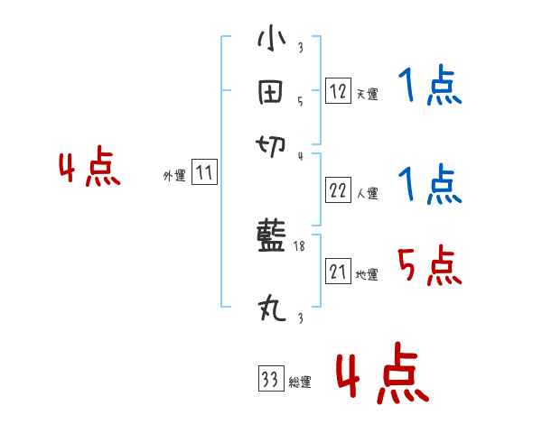 | 外運  | 小田切藍丸さんの外運は11画の4つ星!着実に富や地位を得る幸運な人生。生活面を象徴する運勢です。外部から受ける影響力を表し、結婚運、家庭運や職場、環境への順応性を表します。 |