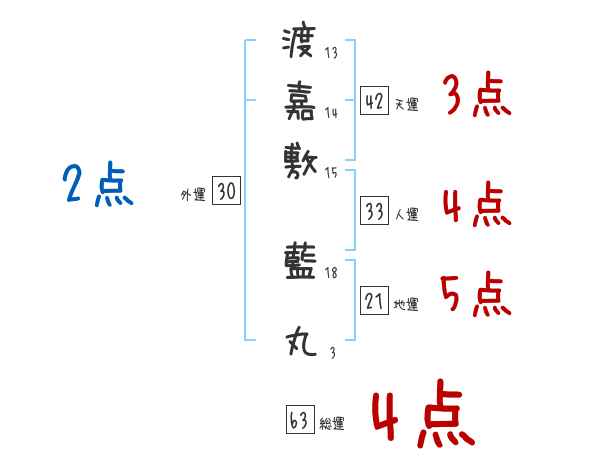 総運![]() | 渡嘉敷藍丸さんの総運は63画の4つ星!家庭運がよく順調な生活。温和な性格。 あなたの人生を表す1番重要な運勢です。生涯を通じて影響する総合運となり、主に50歳以降の晩年期に影響を及ぼします。 |