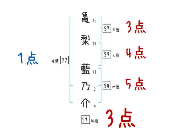 外運![]() | 亀梨藍乃介さんの外運は22画の1つ星!努力することが苦手ないっぽう手先が器用。芸術性にも優れる。 生活面を象徴する運勢です。外部から受ける影響力を表し、結婚運、家庭運や職場、環境への順応性を表します。 |