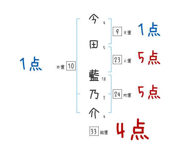 外運![]() | 今田藍乃介さんの外運は10画の1つ星!不安を感じやすい傾向。ストレスを抱えないように注意しましょう。 生活面を象徴する運勢です。外部から受ける影響力を表し、結婚運、家庭運や職場、環境への順応性を表します。 |
