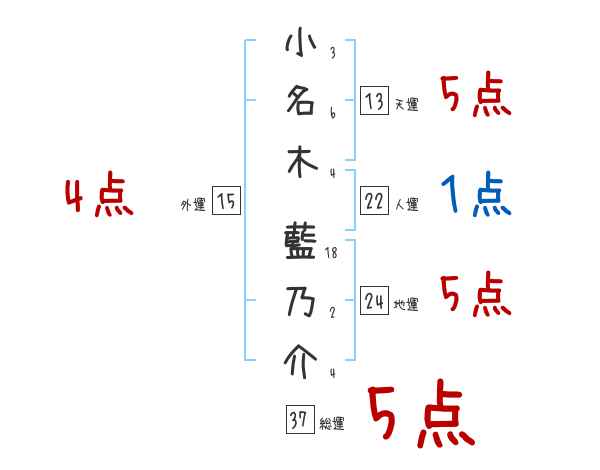 地運![]() | 小名木藍乃介さんの地運は24画の5つ星!家庭運が良く順調な人生。金運にも恵まれる。 個性を表す基礎的な運勢です。性格形成や対人関係、行動力など家庭環境に影響されます。主に誕生してから20歳くらいまでの若年期の運勢を表します。 |