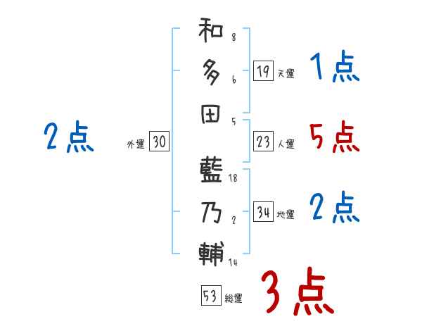 総運![]() | 和多田藍乃輔さんの総運は53画の3つ星!やや見栄っ張りで虚栄心がある。散財に注意。 あなたの人生を表す1番重要な運勢です。生涯を通じて影響する総合運となり、主に50歳以降の晩年期に影響を及ぼします。 |