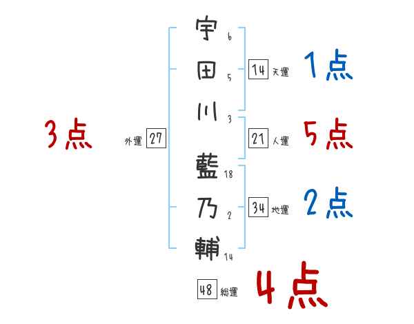 総運![]() | 宇田川藍乃輔さんの総運は48画の4つ星!賢明な性格で人望が厚い。指導力があり多くの人に尊敬される。 あなたの人生を表す1番重要な運勢です。生涯を通じて影響する総合運となり、主に50歳以降の晩年期に影響を及ぼします。 |