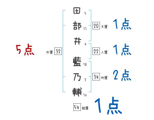 外運![]() | 田部井藍乃輔さんの外運は32画の5つ星!柔軟性があり成功する。チャンスが多く金運が良い。 生活面を象徴する運勢です。外部から受ける影響力を表し、結婚運、家庭運や職場、環境への順応性を表します。 |