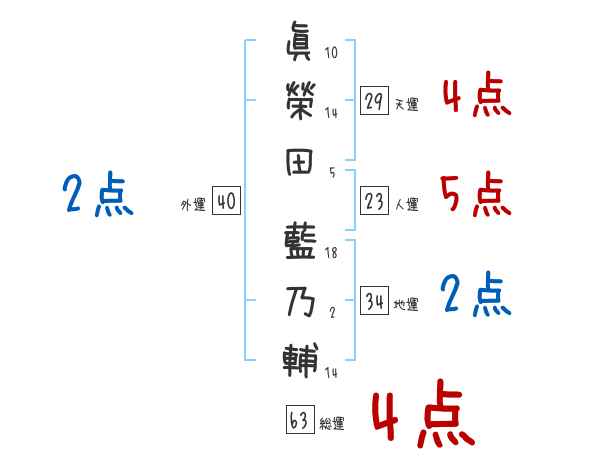 総運![]() | 眞榮田藍乃輔さんの総運は63画の4つ星!家庭運がよく順調な生活。温和な性格。 あなたの人生を表す1番重要な運勢です。生涯を通じて影響する総合運となり、主に50歳以降の晩年期に影響を及ぼします。 |