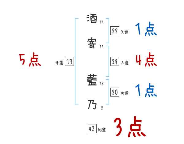 天運![]() | 酒寄藍乃さんの天運は22画の1つ星!努力することが苦手ないっぽう手先が器用。芸術性にも優れる。 家系が持つ宿命的な運勢を表します。祖先から受け継いだ苗字ですので自分の力が及びません。家柄を象徴します。 |