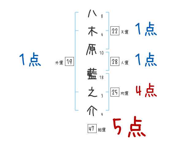 天運![]() | 八木原藍之介さんの天運は22画の1つ星!努力することが苦手ないっぽう手先が器用。芸術性にも優れる。 家系が持つ宿命的な運勢を表します。祖先から受け継いだ苗字ですので自分の力が及びません。家柄を象徴します。 |