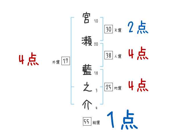 総運![]() | 宮瀬藍之介さんの総運は55画の1つ星!欲張りな性格で軽率な行動に注意しましょう。病気に気をつけて。 あなたの人生を表す1番重要な運勢です。生涯を通じて影響する総合運となり、主に50歳以降の晩年期に影響を及ぼします。 |