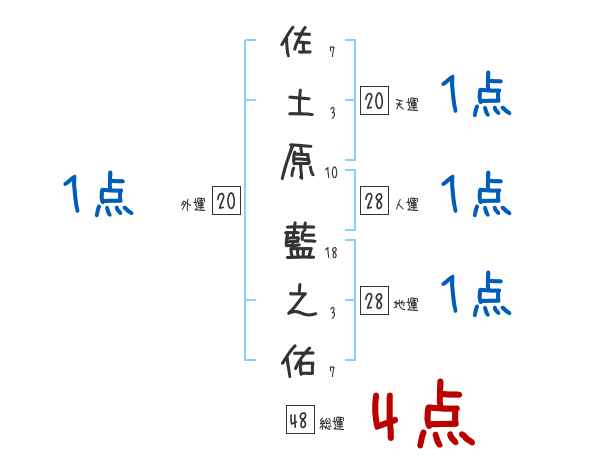 人運![]() | 佐土原藍之佑さんの人運は28画の1つ星!家庭環境に注意。スポーツで活躍できる能力があるかも。 性格や才能などを表す2番目に重要な運勢です。人間関係や協調性、社会的な成功に影響します。主に20歳から50歳ぐらいまでの中年期の運勢を表します。 |