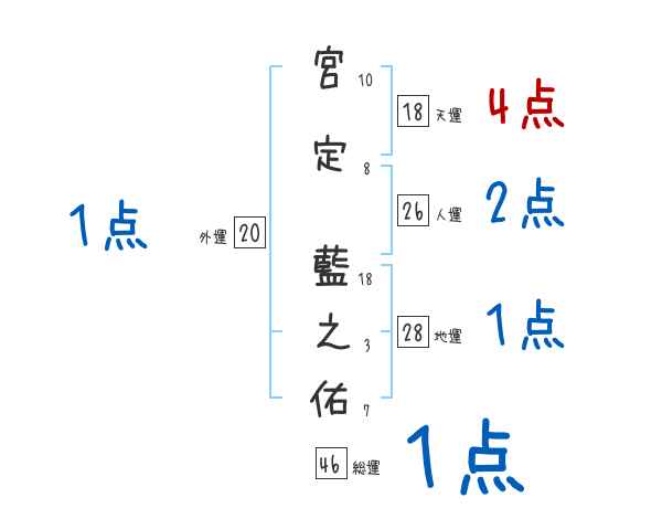 天運![]() | 宮定藍之佑さんの天運は18画の4つ星!情熱的で剛気。忍耐力があり信頼される。 家系が持つ宿命的な運勢を表します。祖先から受け継いだ苗字ですので自分の力が及びません。家柄を象徴します。 |