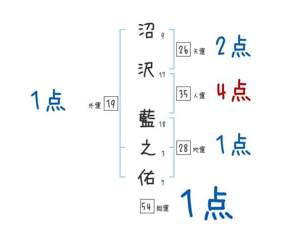 総運![]() | 沼沢藍之佑さんの総運は54画の1つ星!トラブルが多いかも。周りをよく見て協調して過ごしましょう。 あなたの人生を表す1番重要な運勢です。生涯を通じて影響する総合運となり、主に50歳以降の晩年期に影響を及ぼします。 |
