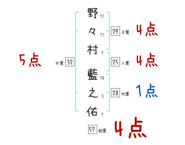 外運![]() | 野々村藍之佑さんの外運は32画の5つ星!柔軟性があり成功する。チャンスが多く金運が良い。 生活面を象徴する運勢です。外部から受ける影響力を表し、結婚運、家庭運や職場、環境への順応性を表します。 |