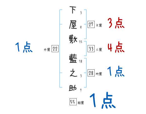 地運![]() | 下屋敷藍之助さんの地運は28画の1つ星!家庭環境に注意。スポーツで活躍できる能力があるかも。 個性を表す基礎的な運勢です。性格形成や対人関係、行動力など家庭環境に影響されます。主に誕生してから20歳くらいまでの若年期の運勢を表します。 |
