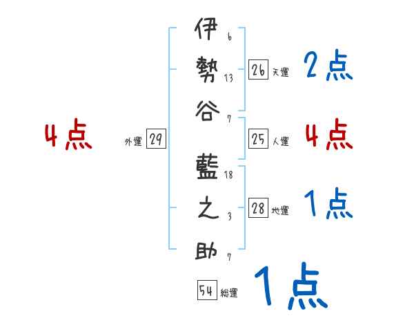 天運![]() | 伊勢谷藍之助さんの天運は26画の2つ星!波瀾万丈かも。信頼できる人を大事にしましょう。 家系が持つ宿命的な運勢を表します。祖先から受け継いだ苗字ですので自分の力が及びません。家柄を象徴します。 |