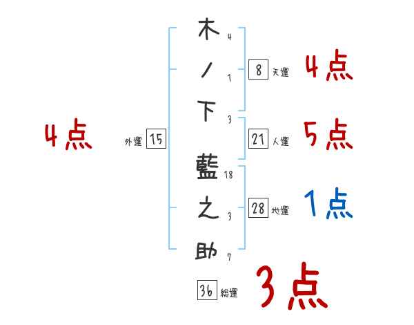 | 総運  | 木ノ下藍之助さんの総運は36画の3つ星!先見性が豊かです。多少神経質で苦労することも。あなたの人生を表す1番重要な運勢です。生涯を通じて影響する総合運となり、主に50歳以降の晩年期に影響を及ぼします。 |