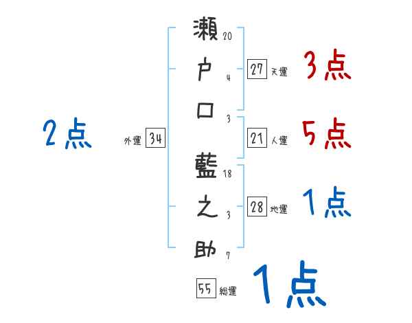 外運![]() | 瀬戸口藍之助さんの外運は34画の2つ星!独創性に優れるが、自尊心が強く災難に注意しましょう。 生活面を象徴する運勢です。外部から受ける影響力を表し、結婚運、家庭運や職場、環境への順応性を表します。 |