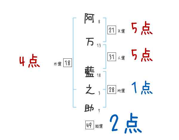 地運![]() | 阿万藍之助さんの地運は28画の1つ星!家庭環境に注意。スポーツで活躍できる能力があるかも。 個性を表す基礎的な運勢です。性格形成や対人関係、行動力など家庭環境に影響されます。主に誕生してから20歳くらいまでの若年期の運勢を表します。 |