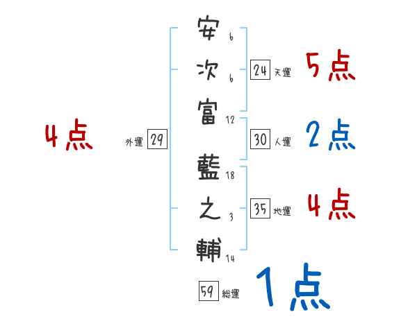 天運![]() | 安次富藍之輔さんの天運は24画の5つ星!家庭運が良く順調な人生。金運にも恵まれる。 家系が持つ宿命的な運勢を表します。祖先から受け継いだ苗字ですので自分の力が及びません。家柄を象徴します。 |