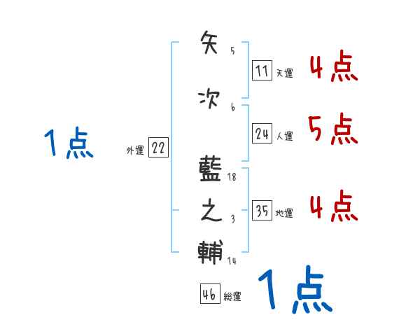 天運![]() | 矢次藍之輔さんの天運は11画の4つ星!着実に富や地位を得る幸運な人生。 家系が持つ宿命的な運勢を表します。祖先から受け継いだ苗字ですので自分の力が及びません。家柄を象徴します。 |