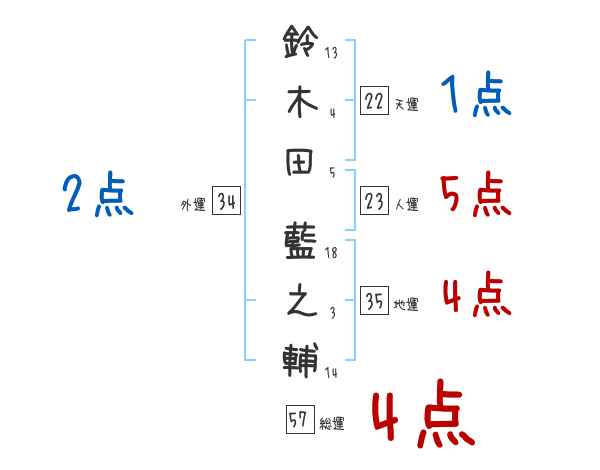 人運![]() | 鈴木田藍之輔さんの人運は23画の5つ星!想像力に優れ活力がある。一代で成功し名誉を手に入れる。 性格や才能などを表す2番目に重要な運勢です。人間関係や協調性、社会的な成功に影響します。主に20歳から50歳ぐらいまでの中年期の運勢を表します。 |