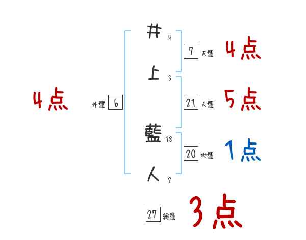 天運![]() | 井上藍人さんの天運は7画の4つ星!強い意志や信念を持ち独立心が強い。自立する。 家系が持つ宿命的な運勢を表します。祖先から受け継いだ苗字ですので自分の力が及びません。家柄を象徴します。 |