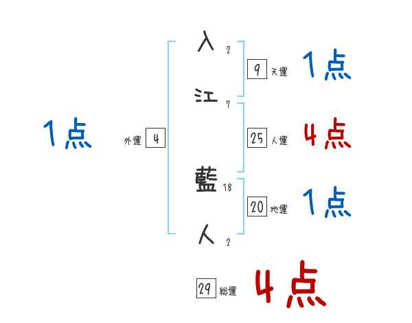 天運![]() | 入江藍人さんの天運は9画の1つ星!消極的で才能を発揮することが苦手なことも。周りの意見に耳を傾けましょう。 家系が持つ宿命的な運勢を表します。祖先から受け継いだ苗字ですので自分の力が及びません。家柄を象徴します。 |
