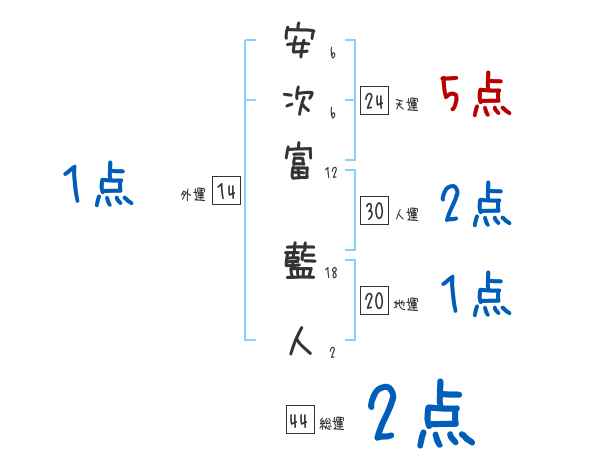 天運![]() | 安次富藍人さんの天運は24画の5つ星!家庭運が良く順調な人生。金運にも恵まれる。 家系が持つ宿命的な運勢を表します。祖先から受け継いだ苗字ですので自分の力が及びません。家柄を象徴します。 |
