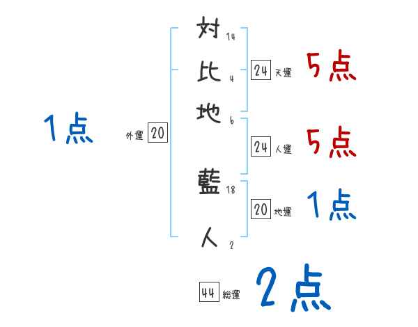 総運![]() | 対比地藍人さんの総運は44画の2つ星!誠実で慎重な性格。物事を考えすぎないように注意しましょう。 あなたの人生を表す1番重要な運勢です。生涯を通じて影響する総合運となり、主に50歳以降の晩年期に影響を及ぼします。 |