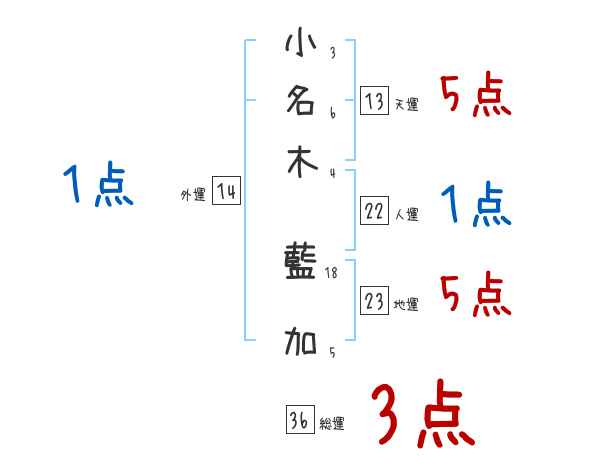 天運![]() | 小名木藍加さんの天運は13画の5つ星!才能に恵まれ人気がある。名声を手に入れる。円満な人生。 家系が持つ宿命的な運勢を表します。祖先から受け継いだ苗字ですので自分の力が及びません。家柄を象徴します。 |