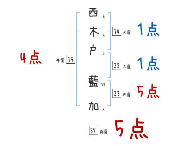外運![]() | 西木戸藍加さんの外運は15画の4つ星!人徳があり出世する。順調に物事を進め円満な人生。 生活面を象徴する運勢です。外部から受ける影響力を表し、結婚運、家庭運や職場、環境への順応性を表します。 |