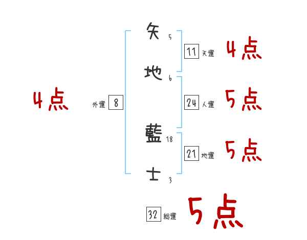 総運![]() | 矢地藍士さんの総運は32画の5つ星!柔軟性があり成功する。チャンスが多く金運が良い。 あなたの人生を表す1番重要な運勢です。生涯を通じて影響する総合運となり、主に50歳以降の晩年期に影響を及ぼします。 |