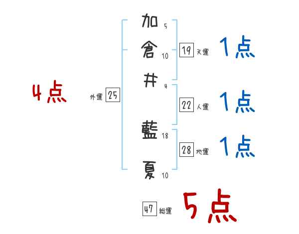 総運![]() | 加倉井藍夏さんの総運は47画の5つ星!実力が開花し発展する円満な人生。財に恵まれる。 あなたの人生を表す1番重要な運勢です。生涯を通じて影響する総合運となり、主に50歳以降の晩年期に影響を及ぼします。 |