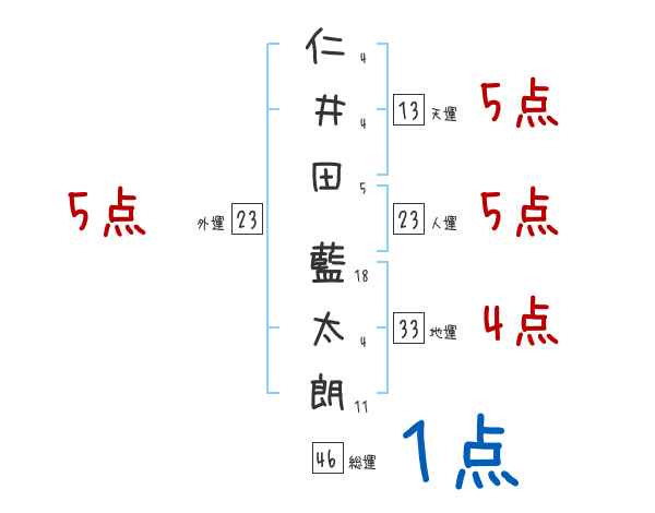 外運![]() | 仁井田藍太朗さんの外運は23画の5つ星!想像力に優れ活力がある。一代で成功し名誉を手に入れる。 生活面を象徴する運勢です。外部から受ける影響力を表し、結婚運、家庭運や職場、環境への順応性を表します。 |