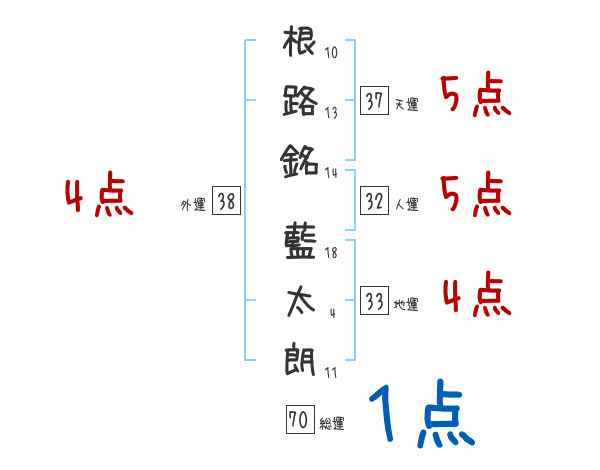 人運![]() | 根路銘藍太朗さんの人運は32画の5つ星!柔軟性があり成功する。チャンスが多く金運が良い。 性格や才能などを表す2番目に重要な運勢です。人間関係や協調性、社会的な成功に影響します。主に20歳から50歳ぐらいまでの中年期の運勢を表します。 |