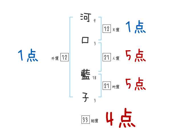 天運![]() | 河口藍子さんの天運は12画の1つ星!簡単な失敗で諦めてしまいやすいかも。着実に行動すると良いでしょう。 家系が持つ宿命的な運勢を表します。祖先から受け継いだ苗字ですので自分の力が及びません。家柄を象徴します。 |