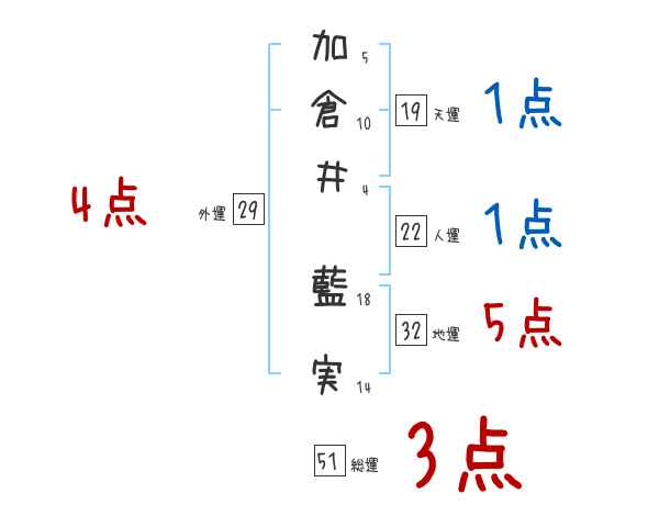 外運![]() | 加倉井藍実さんの外運は29画の4つ星!完全主義で才能がある。厳格な心の持ち主。 生活面を象徴する運勢です。外部から受ける影響力を表し、結婚運、家庭運や職場、環境への順応性を表します。 |