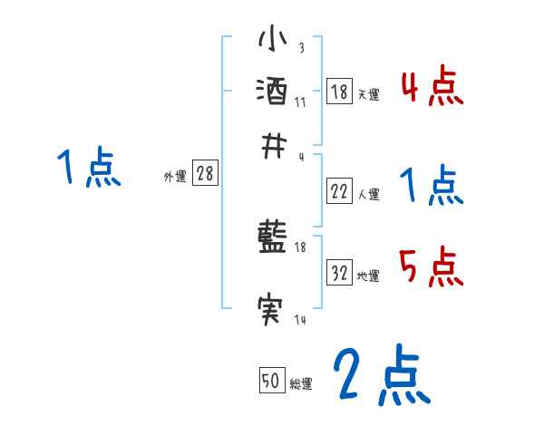 天運![]() | 小酒井藍実さんの天運は18画の4つ星!情熱的で剛気。忍耐力があり信頼される。 家系が持つ宿命的な運勢を表します。祖先から受け継いだ苗字ですので自分の力が及びません。家柄を象徴します。 |