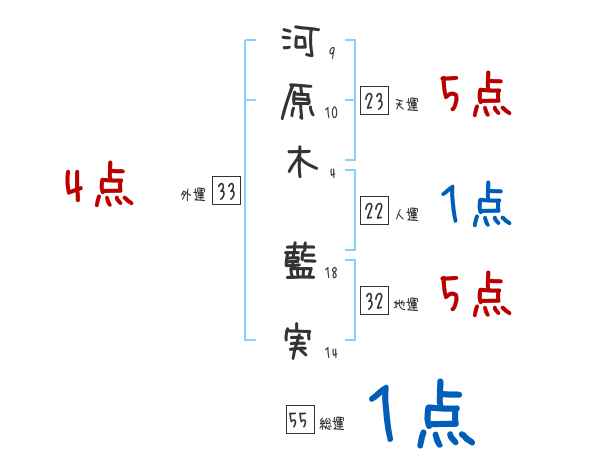 天運![]() | 河原木藍実さんの天運は23画の5つ星!想像力に優れ活力がある。一代で成功し名誉を手に入れる。 家系が持つ宿命的な運勢を表します。祖先から受け継いだ苗字ですので自分の力が及びません。家柄を象徴します。 |