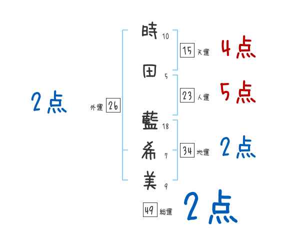 外運![]() | 時田藍希美さんの外運は26画の2つ星!波瀾万丈かも。信頼できる人を大事にしましょう。 生活面を象徴する運勢です。外部から受ける影響力を表し、結婚運、家庭運や職場、環境への順応性を表します。 |