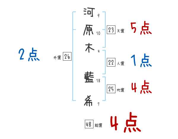天運![]() | 河原木藍希さんの天運は23画の5つ星!想像力に優れ活力がある。一代で成功し名誉を手に入れる。 家系が持つ宿命的な運勢を表します。祖先から受け継いだ苗字ですので自分の力が及びません。家柄を象徴します。 |