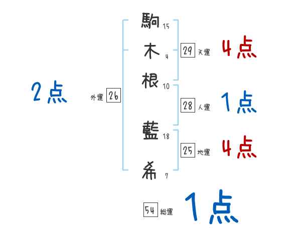 外運![]() | 駒木根藍希さんの外運は26画の2つ星!波瀾万丈かも。信頼できる人を大事にしましょう。 生活面を象徴する運勢です。外部から受ける影響力を表し、結婚運、家庭運や職場、環境への順応性を表します。 |