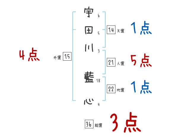 総運![]() | 宇田川藍心さんの総運は36画の3つ星!先見性が豊かです。多少神経質で苦労することも。 あなたの人生を表す1番重要な運勢です。生涯を通じて影響する総合運となり、主に50歳以降の晩年期に影響を及ぼします。 |
