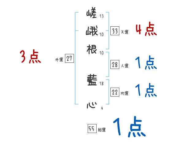 天運![]() | 嵯峨根藍心さんの天運は33画の4つ星!権力志向でプライドが高い。勇気があり運を切り開き成功する。 家系が持つ宿命的な運勢を表します。祖先から受け継いだ苗字ですので自分の力が及びません。家柄を象徴します。 |