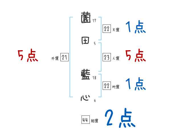 総運![]() | 薗田藍心さんの総運は44画の2つ星!誠実で慎重な性格。物事を考えすぎないように注意しましょう。 あなたの人生を表す1番重要な運勢です。生涯を通じて影響する総合運となり、主に50歳以降の晩年期に影響を及ぼします。 |