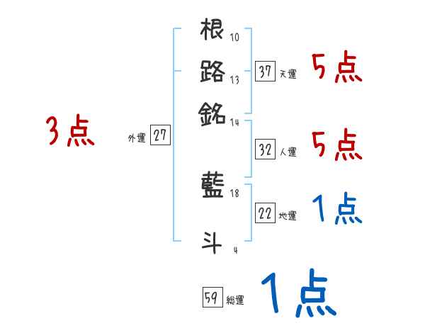 人運![]() | 根路銘藍斗さんの人運は32画の5つ星!柔軟性があり成功する。チャンスが多く金運が良い。 性格や才能などを表す2番目に重要な運勢です。人間関係や協調性、社会的な成功に影響します。主に20歳から50歳ぐらいまでの中年期の運勢を表します。 |