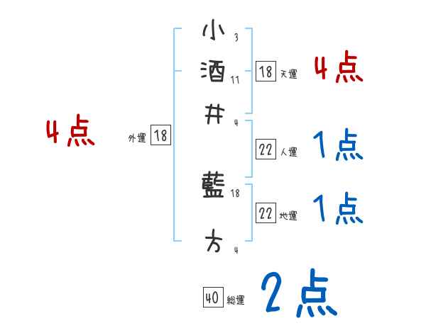 天運![]() | 小酒井藍方さんの天運は18画の4つ星!情熱的で剛気。忍耐力があり信頼される。 家系が持つ宿命的な運勢を表します。祖先から受け継いだ苗字ですので自分の力が及びません。家柄を象徴します。 |